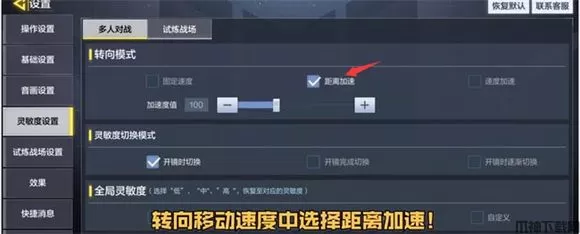 4、值得注意的是,转向移动速度一定要选择距离加速,滑动距离越长,准星移动越快。