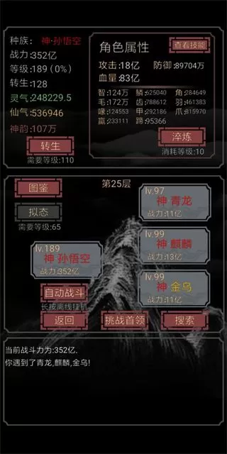 5、技能:击杀敌人后有一定概率获得其种族技能,获得的技能不能重复,但可以和自身技能重复,比如自带学习技能的人族击杀 人族敌人可以再获得一次学习技能,另外推荐几个技能(1学习:必学,增加技能栏,击杀 人族敌人获得;2变化:战斗时每回合获得一个新技能,击杀明石仙猴获得;3真龙血脉:战斗时每回合增加10%全属性,击杀五爪金龙、真龙等获得;4解析:战斗开始时封印对手三个技能,击杀六耳猕猴等获得),学习必学,每次拟态之后第一件事就是去杀 人,真龙血脉可以让你不断变强,后期打战力比自己高的敌人全靠它,变化同理,其他技能建议学习。