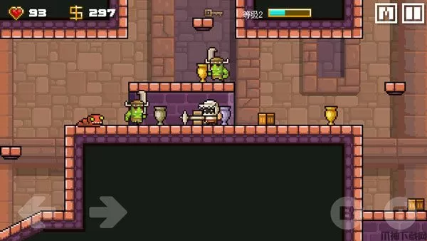 游戏的操作不是很难,在游戏的屏幕左下方有两个方向键控制左右。B键是攻击键,A键是起跳键,长按是下跳。大家注意不要被怪伤到。