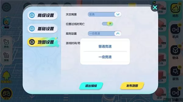 7、【位置过低时死亡】默认状态下【位置过低时死亡】开启,即蛋仔不下心掉落,就要返回上一个存档点。但如果关闭选项,就需要手动布置“死亡区域”,否则蛋仔掉落后就会一直跌落,无法重返关卡。【规则设置】