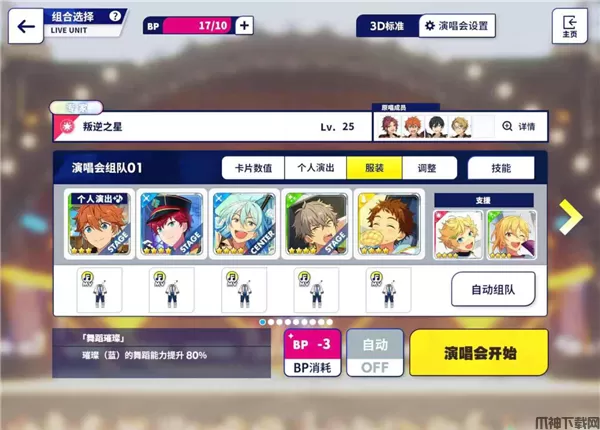游戏中支持玩家自由地设置C位和其他表演成员,给成员换装搭配,欣赏自己pick的角色带来的专属SPP表演,绽放独一无二的光彩!