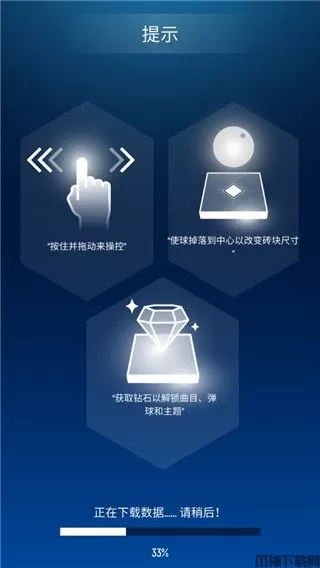 4、按住并拖动来操控,使球掉落到中心以改变砖块尺寸,获取钻石以解锁曲目、弹球和主题;