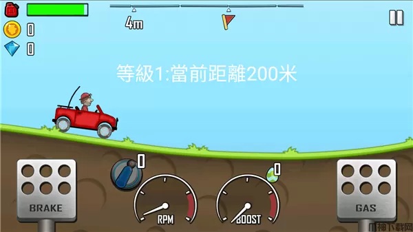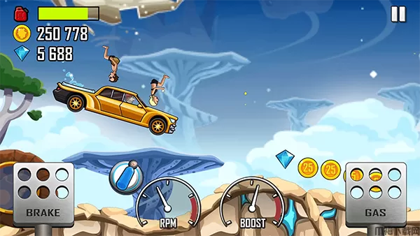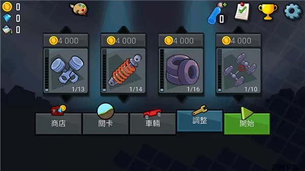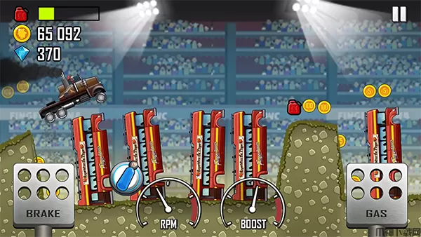 收集金币可以购买新车、开新关卡,升级部件并到达更高距离。游戏难度会根据开出去的距离升级。