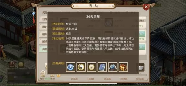一般来说,以上所有任务都清完后,等级会在42-43级左右 如果是修行双倍或者白帮忙副本的双倍,等级可能在45左右。此时,你的任务列表里应该还有天罡星以及上古妖王没有杀(地煞星暂时杀不了,地星需要到55级开启)。这个时候你就要做出一个选择:是在世界频道找队伍一起组队蹲星、上古杀,还是找个地方巡逻升级?