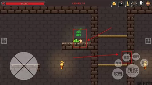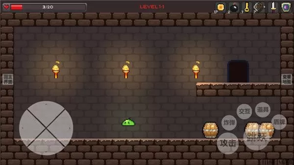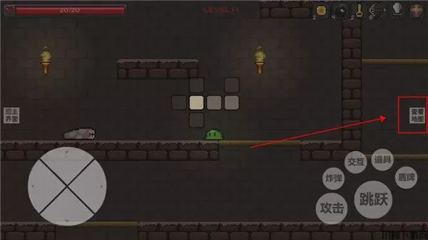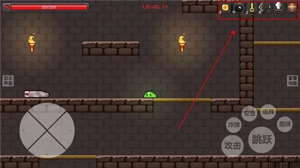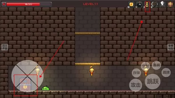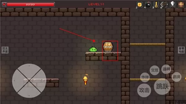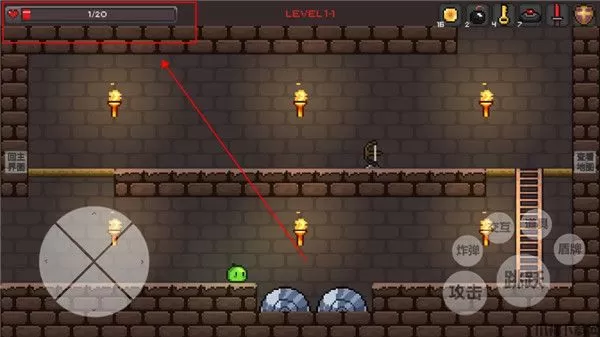 7、左上角是你的血条,一旦归零游戏就会结束,我们可以通过击杀小怪或者是打破箱子获得回复药水