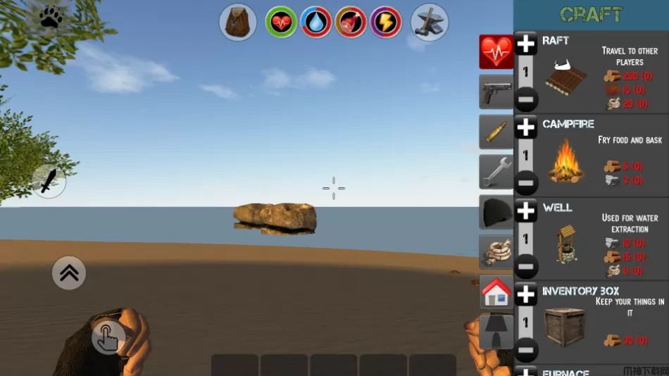 1、生存必用的物品:篝火、煤炉、水井、床等物品,篝火可以烤肉,想点燃篝火要木材。