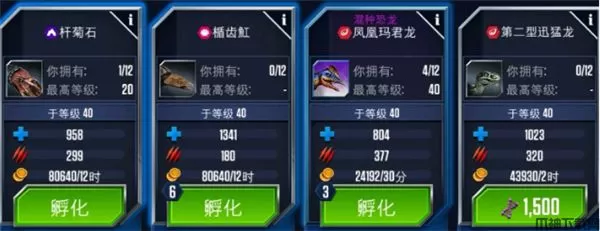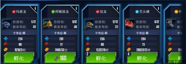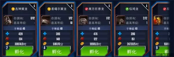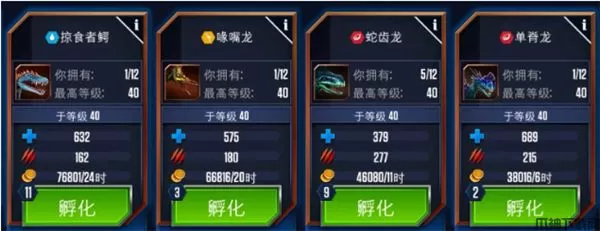 4、孵化所:每一只恐龙的诞生都必须经历一个孵化过程,游戏为玩家免费提供了一个免费孵化器,玩家花费现金可解锁更多孵化器,更快培育恐龙。