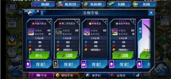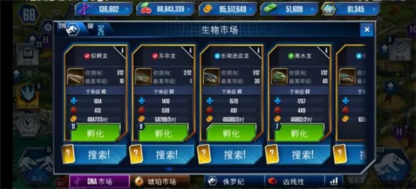 1、DNA:购买、进化恐龙的资源。玩家可通过完成指定任务、获取卡包、出售已有恐龙等方式获取恐龙DNA。
