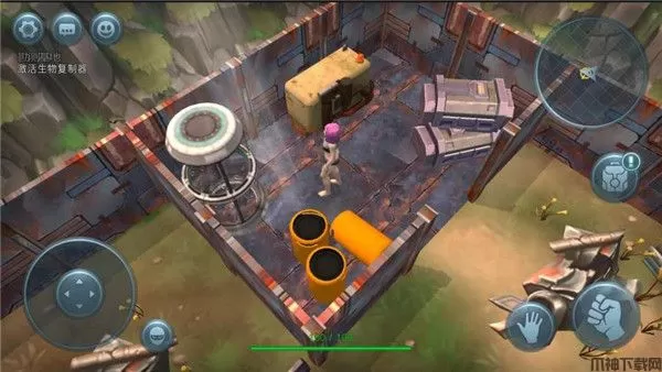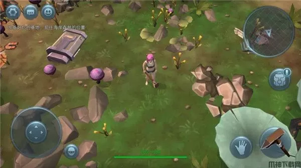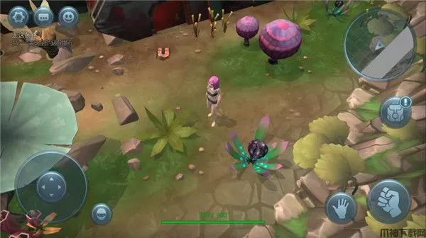 这款游戏的操作玩法也相对简单,左侧是操控角色移动的按键,右侧是手指的图标是物品的采集,拳头则代表着攻击,而接下来就是背包,玩家通过收集的资源物质都会被放置在背包中,点击背包可进行查看预览,其次这里还包括有建造、日志、技能等诸多系统玩法。