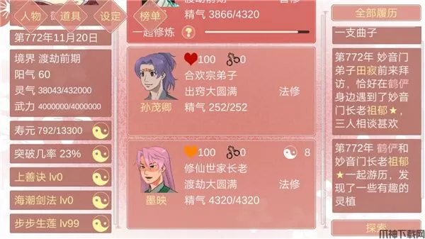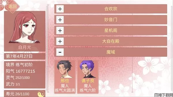 某某宗女修修炼手札最新版是一款非常咸鱼充满狗血的乙女向放置类游戏,游戏拥有精致唯美的粉系画面风格特点,充实多支线的故事剧情发展,互动代入式的游戏体验,可以为玩家带来沉浸式的游戏体验感!游戏中玩家将作为合欢宗的一位女弟子冒险,可以前往各个地方进行探索,解释各种各样的男弟子,通过吸取对方的阳气来获得修为的提升,不断的提高自己的武力值,征服越来越多的人,简单的话来说就是玩家所要做的就是扮演某某宗的女妖选择撩谁和思考怎么在撩了多人的情况下不翻车。同时游戏中各个npc之间会发生各种各样故事,玩家在探险的过程中,可以结识很多的新人物,游戏人物成百上千,各有各的故事,相信一定会有你喜欢的类型!喜欢的玩家还在等什么,不妨下载体验一下试试看吧!