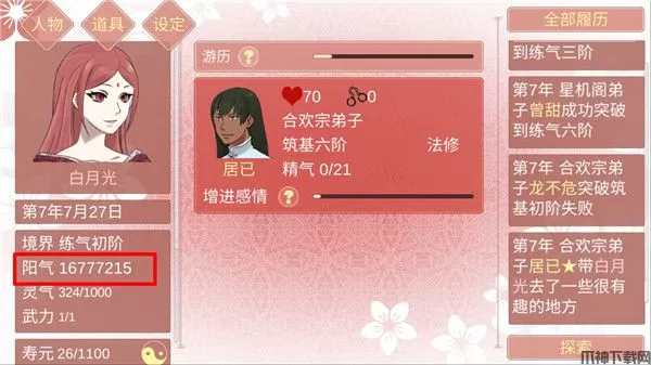 6、合欢宗的男人占有欲未到60前好感最高上限是99。如果送东西送到99会秒掉到98,是因为你没有找他,只要去和他在面板增进感情就可以稳固到99。