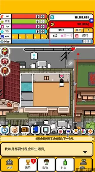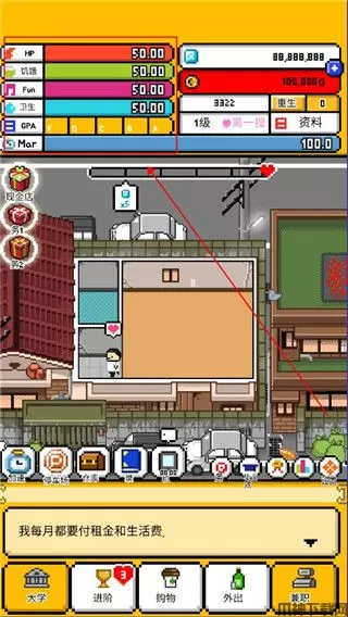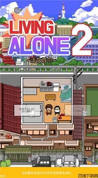 独居2汉化版是一款非常有趣玩法多样的模拟人生类游戏,是unity引擎打造而成的,其画风采用的经典无比的像素风格画风,不管的画面还是里面的人物角色都显得十分独特,能够带给玩家们别样的游戏体验。游戏的玩法非常简单,你将扮演一位脱离父母的大学生,独自来到自己梦寐以求的首尔求学,玩家需要按时努力学习的同时,还需要想办法打工兼职赚取生活费,不断的去提升自己的生活水平,让自己的处境由赤贫到富裕,通过自己的努力让自己过上理想的生活。值得一提的是独居2当中的失败结局非常多,你需要时刻关注自己的健康值、饥饿值、卫生值、愉悦值等一些列的数值,过低的话会对你后续的行动造成很大的阻碍,很容易导致游戏走向失败结局。