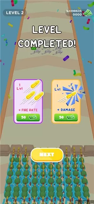 人群进化是一款十分有趣的跑酷冒险类游戏,英文名叫Crowd Evolution。游戏在美术风格上采用了跑酷常见的3D卡通画风,蓝色的可爱火柴人会伴随所处年代的不同,穿上各种具有特色的服饰,罗马帝国士兵的短刀与盾牌、带着斗笠的弓弩,甚至是现代战争中的枪支以及未来世界的激光枪,上下数千年的武器都被游戏包容其中,成为玩家通关的神兵利器。