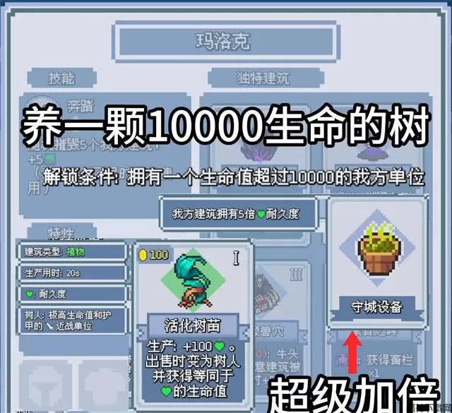 当活化树苗是建筑时,可以接受遗物-守成设备,当活化树苗出售成树人时,可以接受近战单位生命值加成。