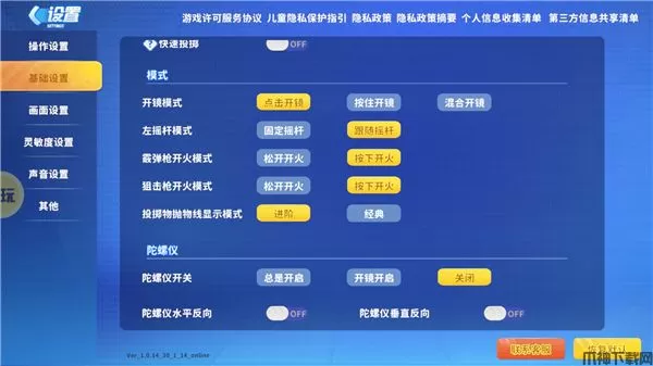 2.基础设置。基础设置,你们会看到功能功能里面没有什么好讲的主要就是辅助瞄准是要开的,因为这样子可以更好的射击对手,更容易精准的击败对手。模式里面开镜就点那个,点击开镜,因为新手还不是很奇怪按住开镜和混合开镜。陀螺仪的话,新手基本上不太会用的,所以就直接关闭。