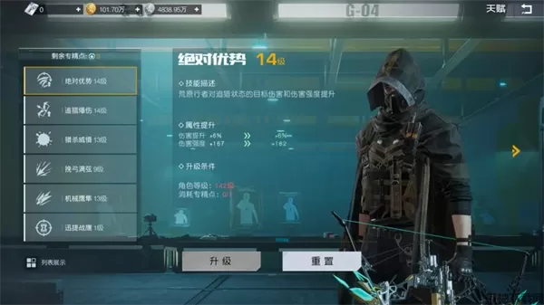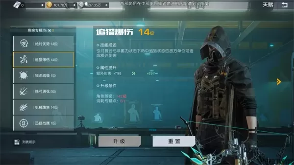 这里首先推荐幸存者们学习“机械鹰隼”这一天赋,这一天赋能够使幸存者通过主武器及重武器的攻击周期性的触发机械鹰隼的攻击,从而为目标施加追猎状态。而在增益方面,优先推荐大家学习“绝对优势”这一天赋,它提供的伤害加成易于触发且提升显著,能够有效地增加你的各类武器伤害。
