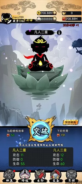 可挂机修炼,获得双倍修为,最高修炼至道尊;小境界直接突破,大境界需要渡过心魔以及渡劫方可晋阶