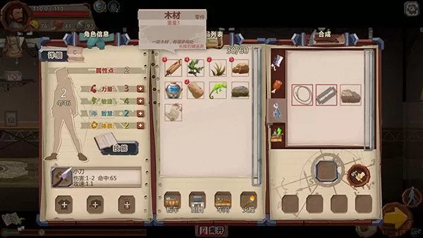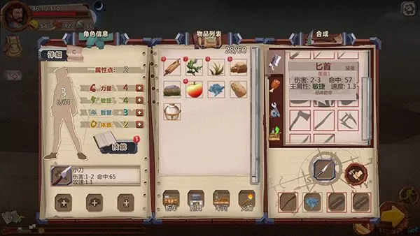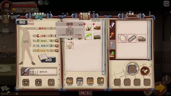 拾荒或者乞讨得来的物品除了直接使用外,多数都可以参与合成。比如可以将肉烹调成烤肉,石子压制成石块,刀片做成厨刀等等。在物品栏右侧便可查看当前可以合成的物品及配方,建议玩家对配方心中有数,随时了解手头可以合成的物品,这对于生存来说至关重要。