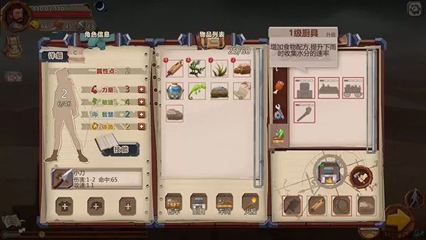 初期玩家合成的内容非常之少,这可以通过升级厨具和车间进行提升。升级厨具能增加烹调食物的种类,升级车间则可以增加武器零件配方。