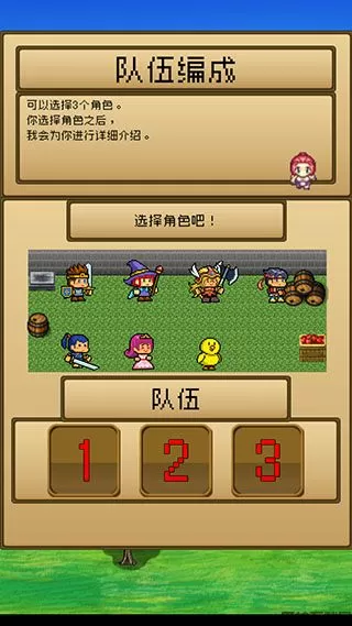1、进入游戏后,通过一段对话后就可以开始组建队伍,建议选择第一排前三个,勇者、战士、魔法师,能打能抗。