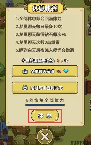 9、没体力挖矿撸树就会MISS,体力进度条在左上角,回家找帐篷睡一觉体力就满了。