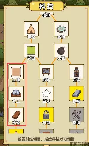11、生产建筑、生产,先学习科技场地,木工桌、木板。再与围墙里面的荒地交互,建造之后变成基座。与基座交互打开建造生产建筑界面,具体流程看下图例。
