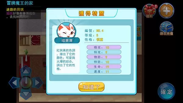 游戏以地图冒险和精灵战斗为核心,将精灵分为10种属性),属性之间具有克制关系,训练师可以根据自己的爱好和需求,选择不同的精灵进行培养。