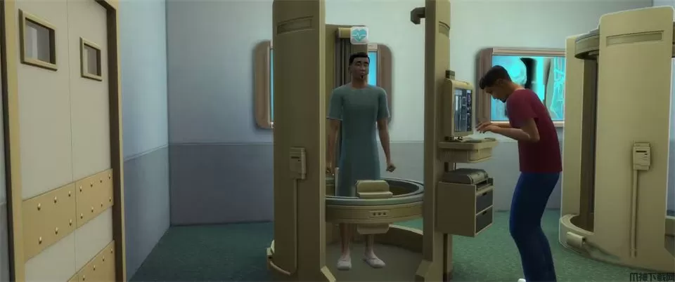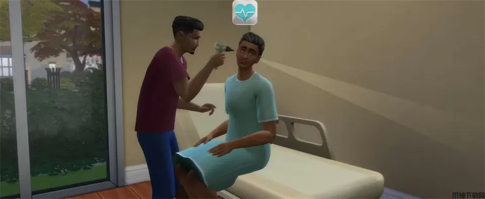 《模拟人生4》中医生通过照亮角色头部检查耳朵的场景。