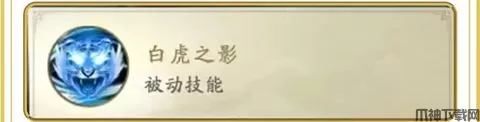 白虎闪避率永久提升6%,且每回合开始时白虎获得“虎影”效果,持续1回合,同时白虎有50%概率抵抗受到的控制效果,每次成功抵抗将提升15%攻击,持续2回合,提升自身45%闪避率,成功闪避1次后效果移除。