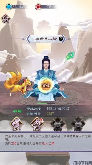 该游戏是一款放置挂机游戏,游戏中玩家将通过对双身份的选择来正式开启你的修真生涯,在初入若君山后,你会发现灵气充盈着这里,绝对是一个闭关修炼的绝佳地点,此处为初始修真者梦寐以求的雅境,在这里玩家可通过手指触控来加速修炼的进度,待灵气聚集到一定范围内,便可突破修气阶段,进入下一个阶段修仙,如图:
