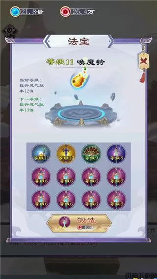 法宝:法宝的升级需要消耗寿元来完成,通过寿元来购买法宝,并将两个相同的法宝进行两两合成,便会将法宝提升至一个新的阶段,法宝的属性则可以帮助提升修炼时的灵气聚集效率。