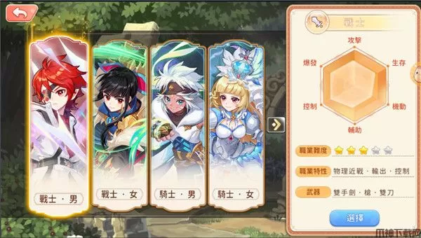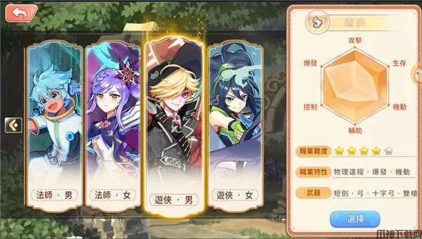 游戏分为四种职业:战士、骑士、法师、游侠,一个职业可转职三次:60级一转、120级二转、160级副职业。