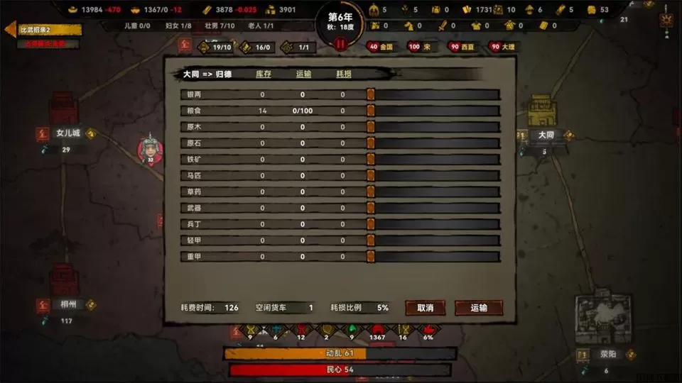 内置随机装备系统,每次掉落都暗藏惊喜,助力战力突破;涂色块式大地图直观清晰,搭配完善的运输系统与据点管理机制,让你在金、宋、西夏、大理四大阵营的争霸中,体验从零到一的疆域扩张快感
