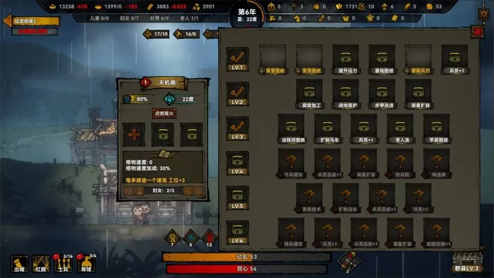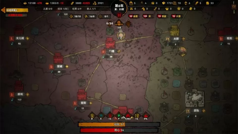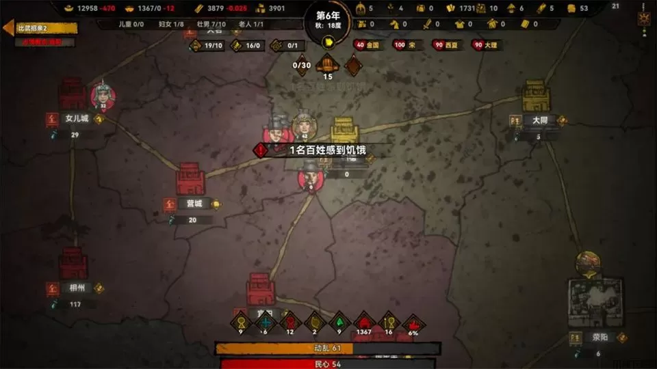 在《大宋烽烟》游戏中设有民心数值,它影响着人口增长、生产效率与叛乱概率。民心的提升需要从多个方面入手,例如,按时发放救济粮、修建医馆与学堂、降低税率、应对自然灾害……