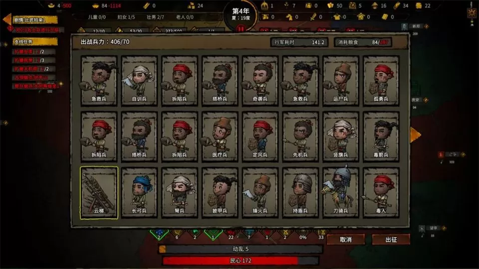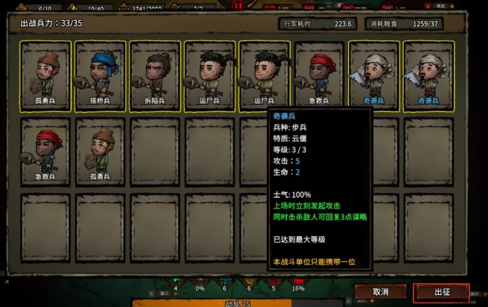 5、选择想带出去的兵,黄色框是已选择,然后点击出征