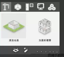 当你选择了建造模式时,就能通过图中各项图标进行从地基到门窗到设备的建设、布置。