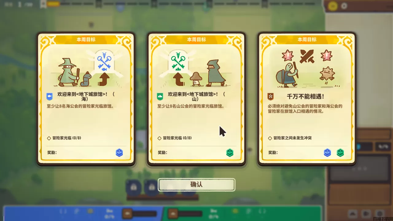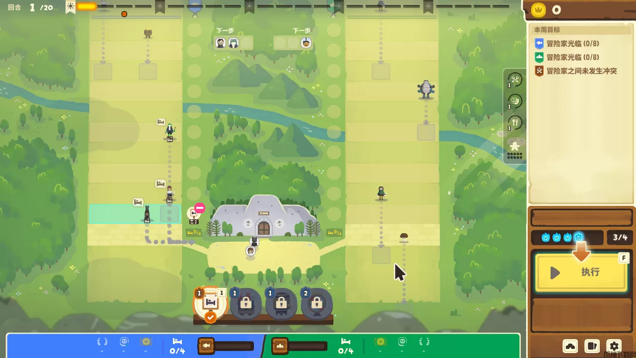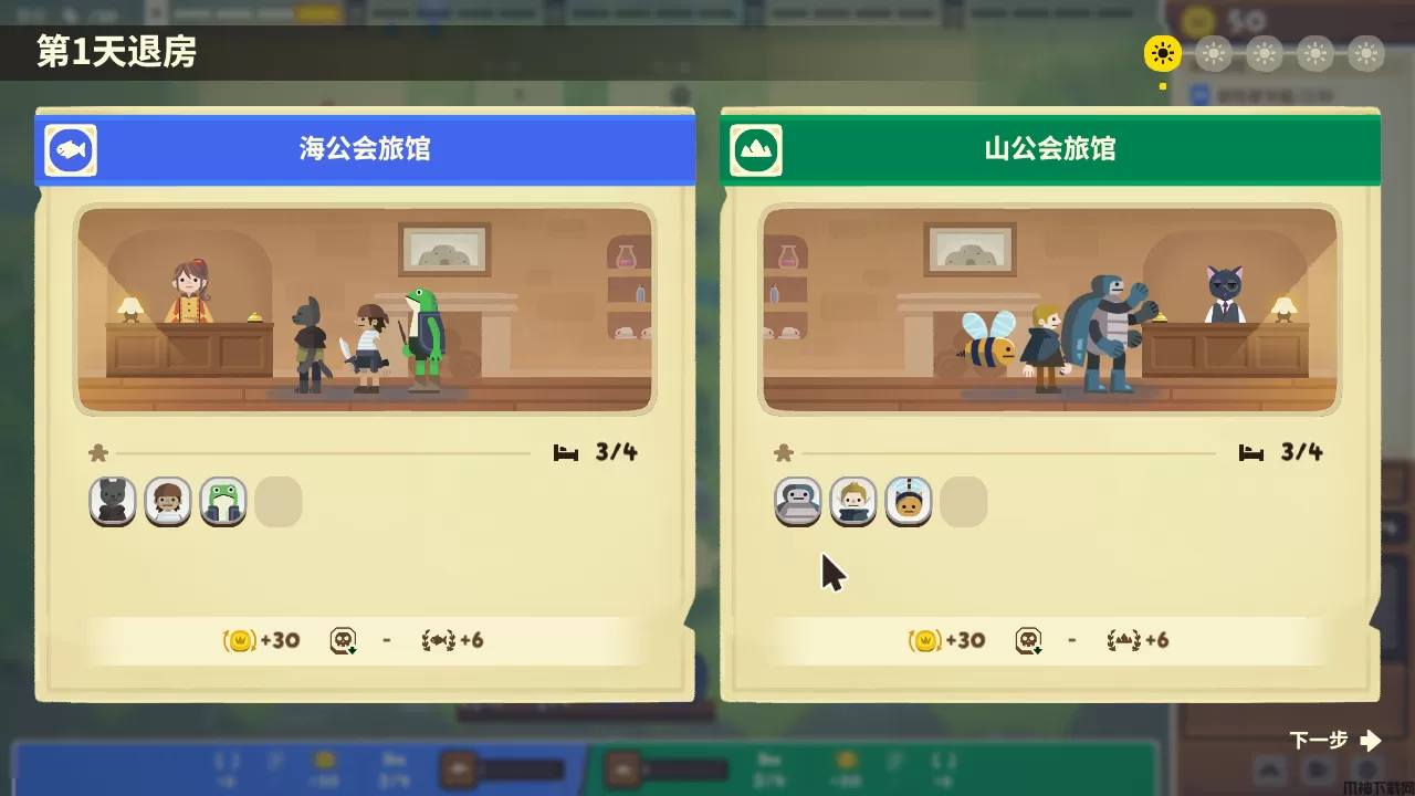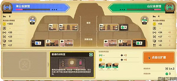 3、旅馆位于最下方,左右便是两个工会的路径,玩家可以使用广告牌,来吸引顾客进入旅馆。