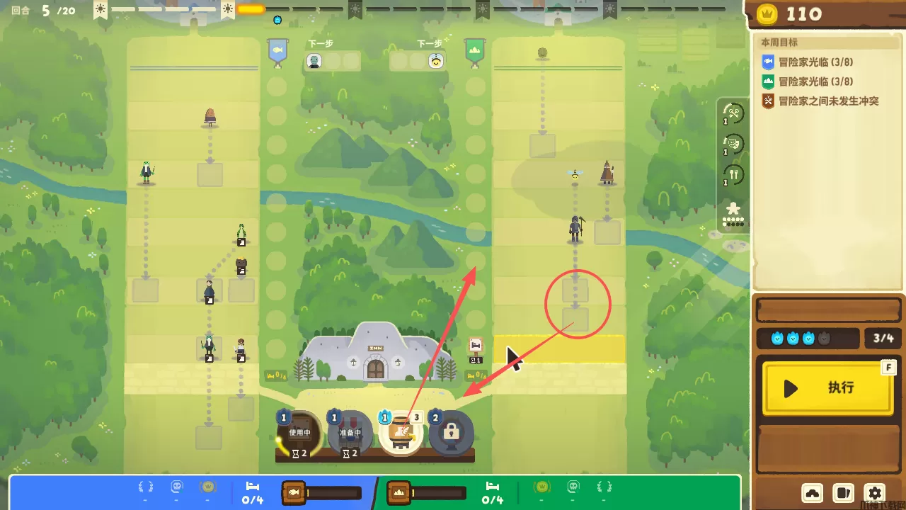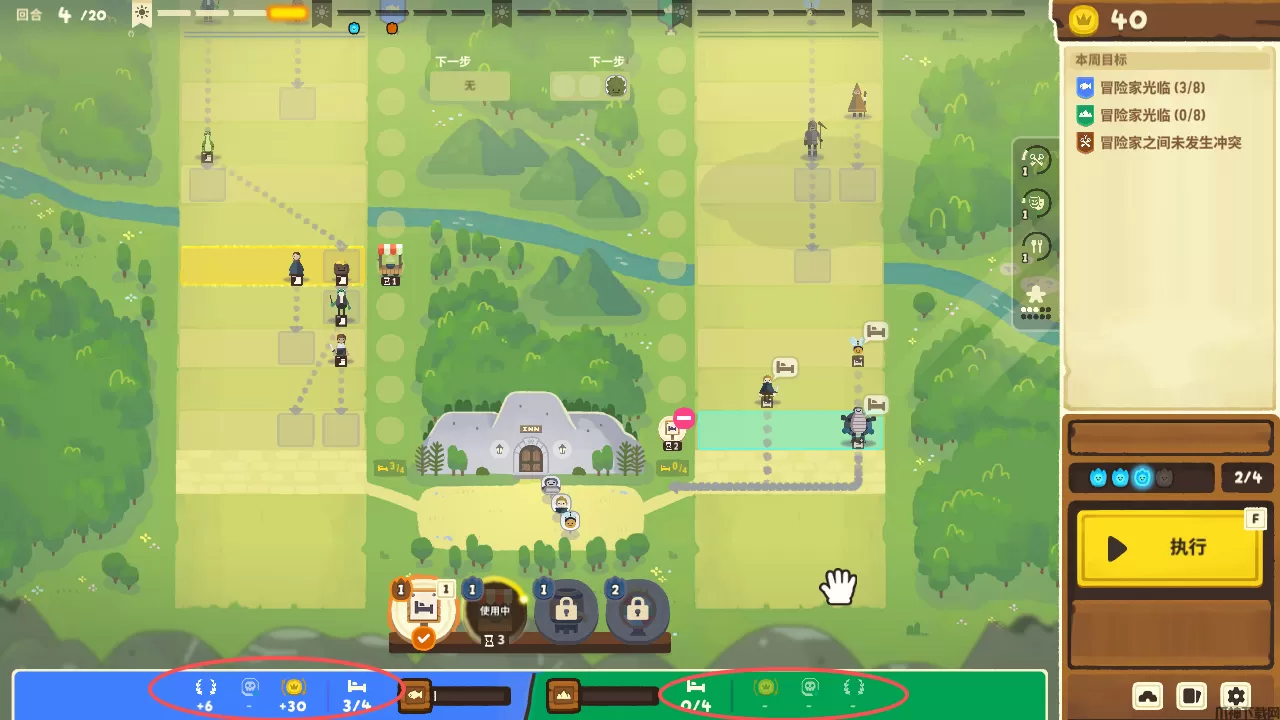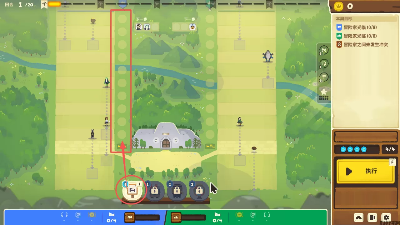 游戏中最重要的是,熟练使用这些道具,游戏中可以明确看见冒险者每回合的前进步数,玩家需要利用小吃摊,能量饮料来阻止或增加他们的行动,确保不会在同一回合进入旅馆,否则就会触发战斗。