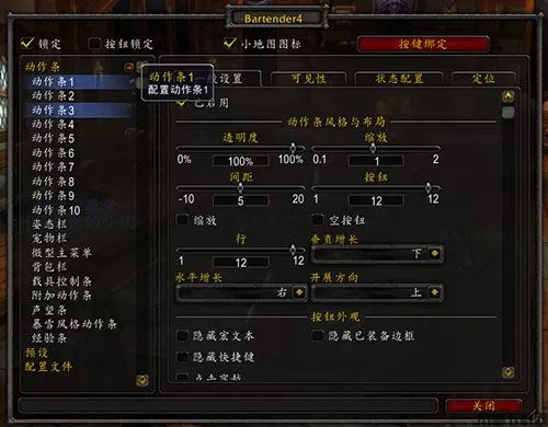 4、可以在插件图形配置界面内设置各个动作条的外观和动作,解锁以拖动动作条到任意位置‘