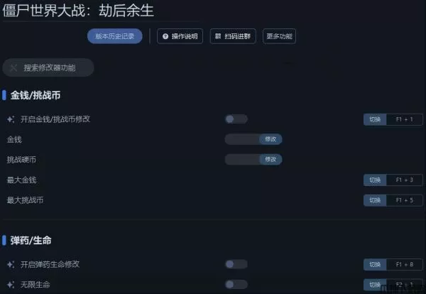 僵尸世界大战劫后余生修改器是专门针对这款游戏制作的游戏辅助。僵尸世界大战劫后余生修改器使用简单,启动游戏,打开修改器玩家可以利用它修改金钱、挑战币、无限弹药、无限生命、超级速度等十项修改功能,帮助你获得更好的畅玩游戏。有喜欢这款游戏的玩家那么千万不要错过这款修改器,快快到本站下载体验吧。