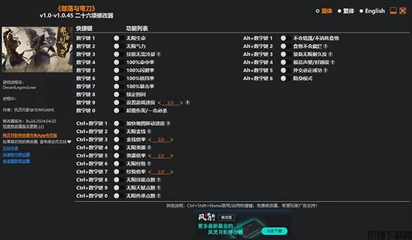 部落与弯刀修改器由风灵月影官方研发打造,能够完美适配于当前游戏版本,并且为玩家提供强大的辅助功能,支持无限生命、无限气力、无限技能点数、无限天赋点数、无限金钱、无限资源、无限经验等多项修改功能,让你轻松完成关卡,获得无限的生命和技能,从此在游戏中所向披靡战无不胜,再也用担心会卡关。部落与弯刀修改器操作使用简单易上手,只需要在运行游戏后打开该修改器,然后按下相对于的快捷键即可随意修改游戏属性,欢迎有兴趣的玩家们免费下载自行体验。