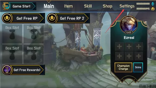 1、首先进入游戏,进入游戏后可以看到在游戏界面上有许多的选项,点击游戏界面右上角的“Settings”选项;
