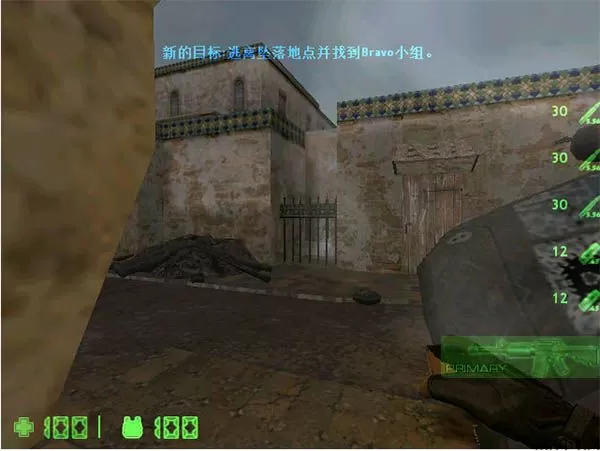 黑鹰已经坠落,伤亡是肯定有的,但仍然有几个三角洲队员深陷重围,“绝对不能让一个弟兄留下“!于是我开始拯救行动。。我呆在燃烧着的黑鹰旁边,这时候敌人已经蜂拥着冲了过来,我端起了手中枪,嗒嗒几个点射。继续往敌人腹地挺进,来到一个房间,解决掉冲出来的两个敌兵,四周一看已经没有路了,我大骂一声一梭子子弹打在了墙边的几个木箱上,墙上一个破洞显了出来,就从这里过去,在铁架上得到炸弹,沿木板上到二楼,只见墙面上红光一闪一闪的,按动5号键可以设置炸弹,然后闪到一边把头一埋按动了手中的引爆器,轰隆一声,墙被炸出一个大洞,我刚刚探出头去观察,就见一束红光扫了过来,我连忙退了进来:狙击手!我装好弹作了一个深呼吸,闪电般冲了出去,子弹不停的呼啸射出,对面楼上发出一声惨叫,敌狙击手栽了下来!上到房顶,进入房间便找到一名三角洲队员,了解了附近的敌情和失散的战友,我们便冲了出去,不能让他牺牲掉,所以我冲在了前面。掩护他进了一个水塔,安全后我便继续搜寻其他失散的战友,旁边两扇木门不能打开,用枪将门后挡住的木箱打烂就可以通过了,来到大院,我军的直升机正要降落,但地面和高墙上全是敌兵,我换成了机枪愤怒的杀了过去,地面全部清除完毕,我在返身寻找队友,一辆吉普车冲了过来,车上跳下几个敌兵,好在我早有准备,枪枪爆头!在旁边的房间找到已经被俘的战友,这家伙看来是吓傻了,呆在原地不肯前行,我告诉他:有我在,一切OK!终于我们安全来到大院,黑鹰已经等候多时了...难点提示:打烂身边任何木箱!