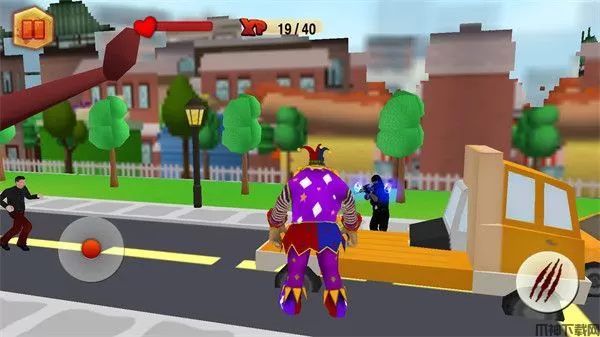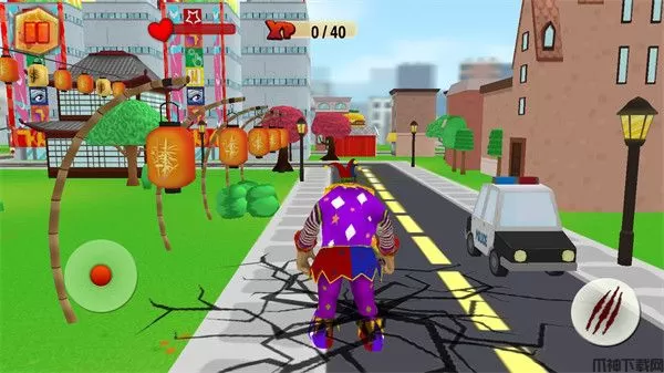 恐怖小丑袭击(Creepy Clown Attack)是一款以小丑为主角的角色扮演手游。该款游戏画面清晰,音效真实。游戏中玩家将扮演一名小丑,但是你扮演的小丑不再是给人们带来欢乐的角色,你需要肆意的破坏城市中的一切,引起人们的恐惧。恐怖小丑袭击游戏的操作采用虚拟摇杆+固定按键的操作方式,屏幕左侧的摇杆可控制主角走位,屏幕右侧则有攻击、投掷、撞击等按键。在你破坏城市的过程中,会有源源不断的警察和警卫队追捕你,因此你需要随时警惕,一旦被抓住,游戏就结束了哦!感兴趣的朋友不妨下载