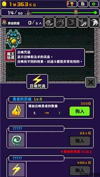 2、点击召唤咒语,可以解锁各种咒语,增加召唤勇者的数量