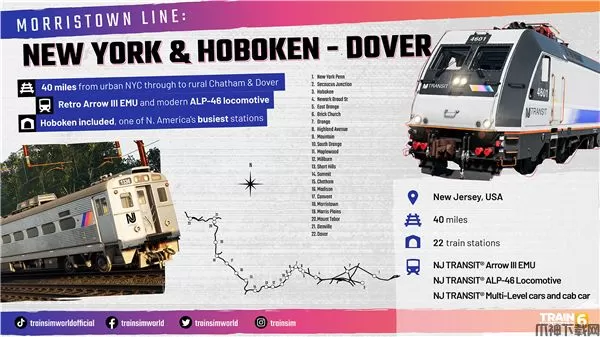 在莫里斯敦线上领略新泽西交通公司® 的电气化铁路网络。穿过莫里斯和埃塞克斯郡的郊区,乘坐经典的 Arrow III 型电力动车组、ALP-46 型机车和多层车厢列车穿梭于纽约市和通勤小镇多佛之间。