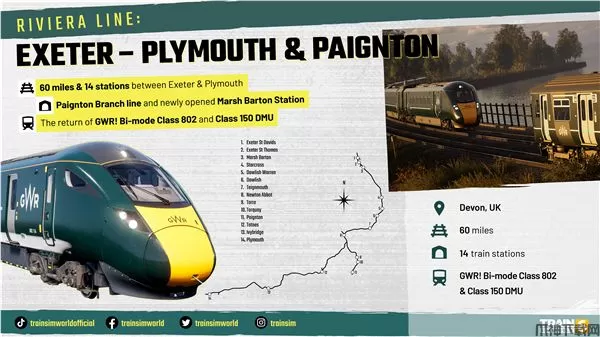 行驶于大名鼎鼎的里维埃拉线,沿着德文岸滩快速前行,并在道利什海堤自由翱翔!驾驶大西铁路列车前往田园诗般的英国沿海城镇,登上“城际列车” 802 型动车组和“短跑手” 150/2 型动车组往返于埃克塞特、普利茅斯和佩恩顿之间。