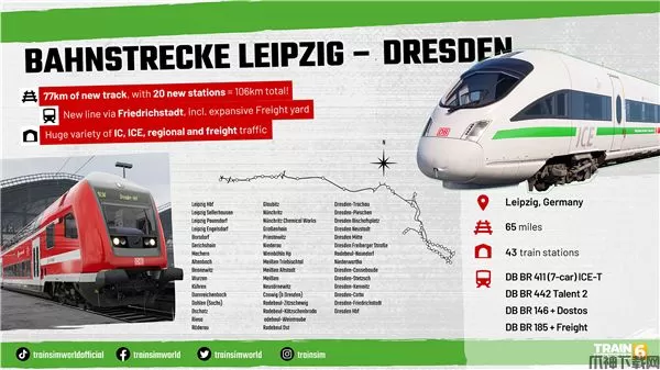 在莱比锡—德累斯顿铁路中跨越德累斯顿区域线的边界,向西加速前行至莱比锡。沿着德国最古老的长途铁路驾驶现代化的 ICE-T 动车组、德铁 442 型动车组、由单机车牵引的客运列车,以及货运列车。
