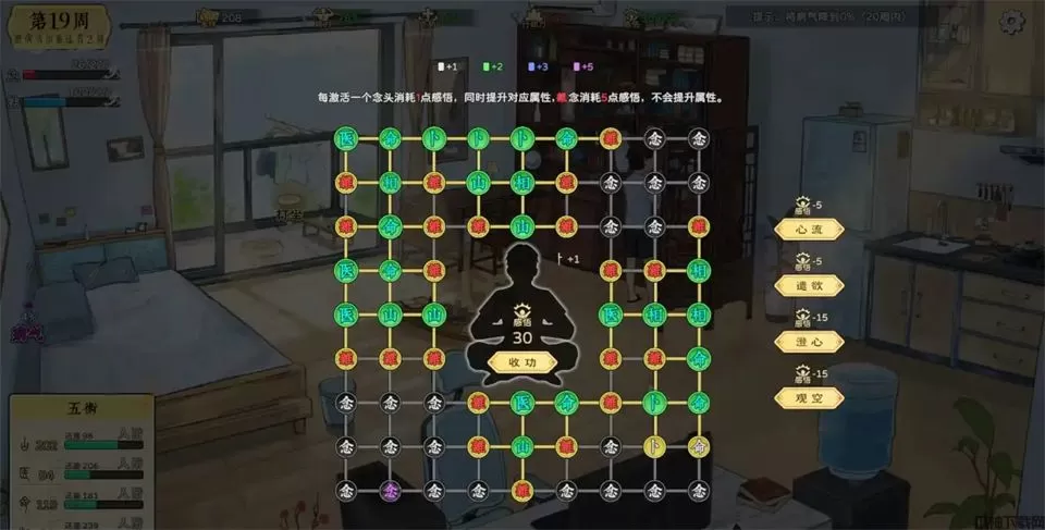 还有一部分是打坐玩法。等到感悟到达50的时候,可以花费这些点数进行打坐,打坐里面可以通过节点点亮的方式增加五术数值,五术结点消耗1点感悟,杂字节点花费5点感悟,这个比较看运气,个人建议属性加成全部点亮,因为这个部分能加的数值很多,远比平时看运气或者出摊加的多。