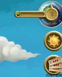 从左到右分别为,计量条(怪物袭击倒计时)时间指针(从白天到黑夜)、指针下方的快进键可以设置游戏进行的速度)